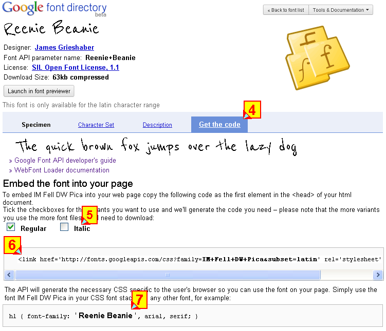 8. Você verá um código para uso da fonte em um título, a tag h1 indica título no HTML, mas, na realidade em muitas páginas este título foi substituído por uma imagem(logotipo) e, muitas pessoas irão querer usar a fonte em toda página, e também, dependendo do Css usado na página será preciso muitas alterações para isso. O mais correto seria pegar o código e usar em body. Apenas um exemplo: